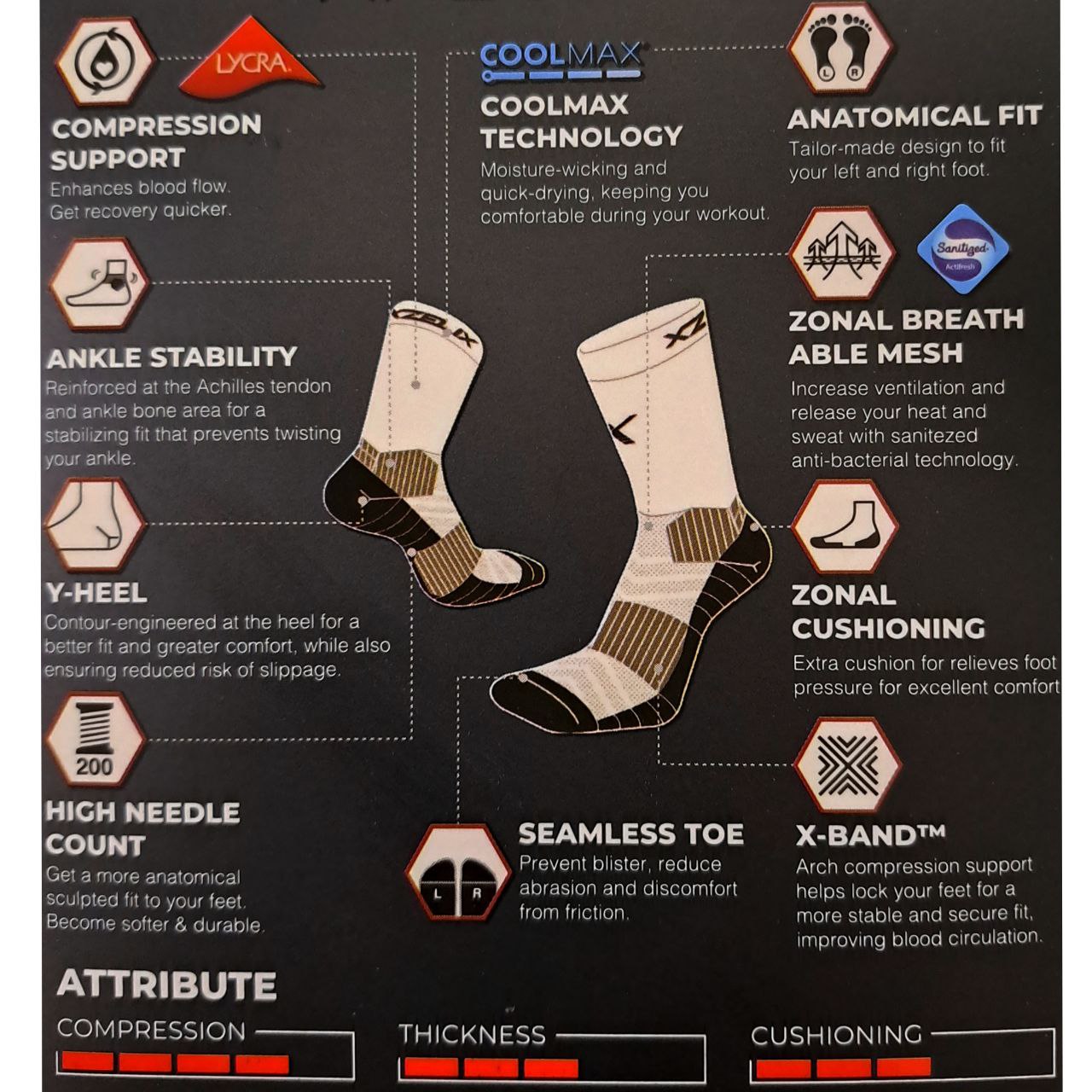 Xplosive คือ ถุงเท้าครึ่งแข้งที่ออกแบบมาเพื่อประสิทธิภาพสูงสุดและความสบายที่พอดี พร้อมวัสดุกันลื่นเพื่อรองรับการเปลี่ยนทิศทางในการเคลื่อนไหว ใช้ด้ายและการออกแบบที่ช่วยซับเหงื่อช่วยให้เท้าของคุณแห้งตลอดเวลา