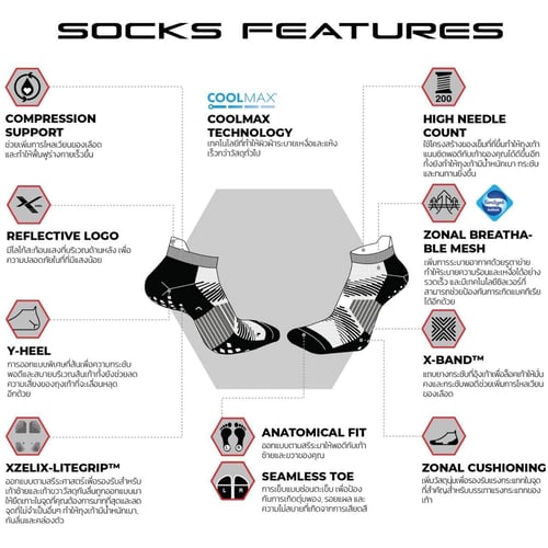 -XZELIX-LITEGRIP™ - ออกแบบตามสรีระศาสตร์ เพื่อรองรับสำหรับเท้าซ้ายและเท้าขวา วัสดุกันลื่นถูกออกแบบมาให้ยึดเกาะในจุดที่คุณต้องการมากที่สุด และลดจุดที่ไม่จำเป็นอื่นๆ ทำให้ถุงเท้ามีน้ำหนักเบา, กันลื่นและคล่องตัว