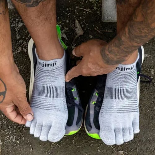 อินจินจิ ถุงเท้าห้านิ้ว ความหนาปกติ Original Weight ความยาวเท่าข้อเท้า No Show เนื้อผ้า COOLMAX ทอพิเศษช่วยให้เท้าแห้งสบาย และเย็น ลดปัญหาการเสียดสี เหมาะกับวิ่งทุกระยะจนถึงระยะมาราธอน