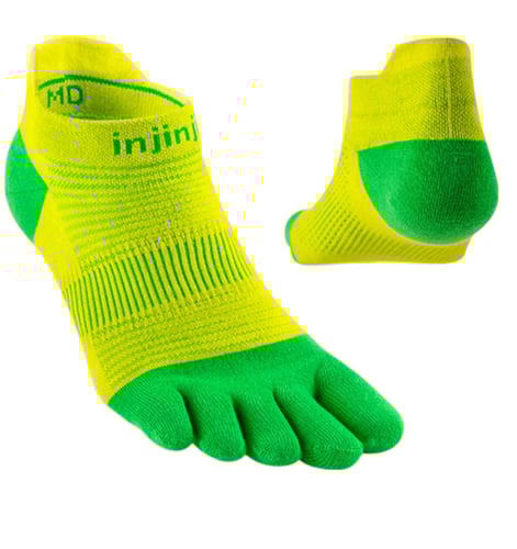 อินจินจิ ถุงเท้าห้านิ้วแบบบาง Lightweight ความยาวเท่าข้อเท้า เนื้อผ้า COOLMAX ทอพิเศษช่วยให้เท้าแห้งสบาย และเย็น ลดปัญหาการเสียดสี เหมาะกับวิ่งทุกระยะจนถึงระยะมาราธอน Product Details Our lowest-bulk sock is built for all types of runs on all kinds of surfaces. Our unique five-toe performance design eliminates the friction that can cause blisters, and keeps your toes free for better feel and natural fit on uneven terrain. Soft, durable seamless construction creates a supportive, secure fit, a mesh top and COOLMAX® fibers help keep feet dry and cool, and a band under the arch provides support and stability. The no-show length rests below the ankle and features a heel tab to protect against chafing and keep your socks from sliding into your shoes.